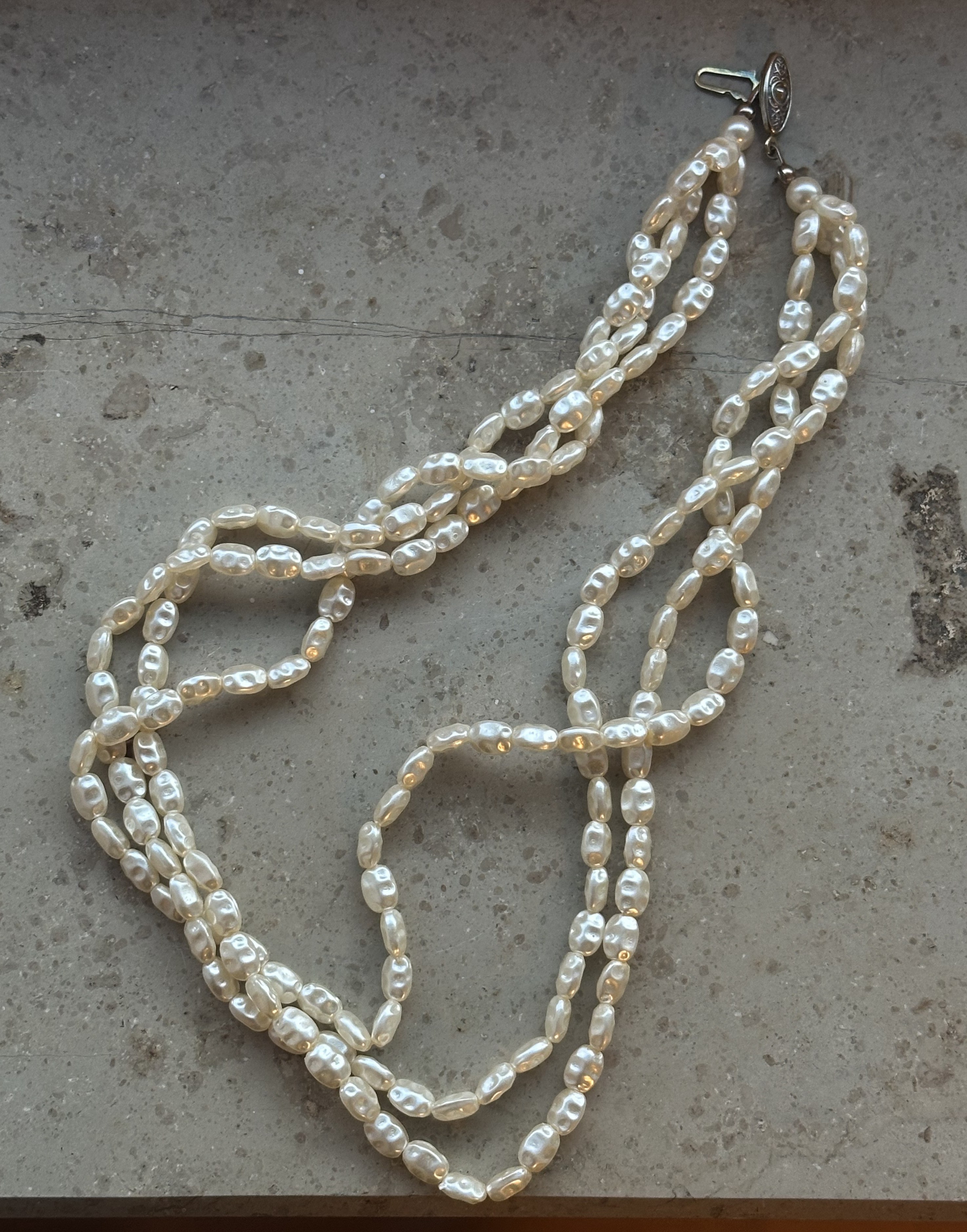 3줄로 촘촘히 엮인 라이스 펄 (rice pearls)이 우아하게 레이어드된 빈티지 목걸이입니다. 작은 쌀알 형태의 폭스 진주가 가지런히 배열되며 자연스러운 볼륨과 깊이를 만들어내고, 움직임에 따라 은은하게 반사되는 광택이 목선을 아름답게 돋보이게 합니다. 클래식한 디테일이 살아 있는 골드 클라스프는 전체 디자인에 고급스러움을 더해주며, 3줄 레이어의 균형과 완성도를 한층 높여줍니다. 단독으로 착용해도 충분히 존재감 있는 아이템이며, 드레스업한 룩과 빈티지 스타일 모두에 잘 어울립니다. 시간의 깊이가 담긴 빈티지 진주 특유의 매력과 부드러운 광택이 조화를 이루어, 오래 두고 사용할수록 더욱 가치가 느껴지는 주얼리입니다.