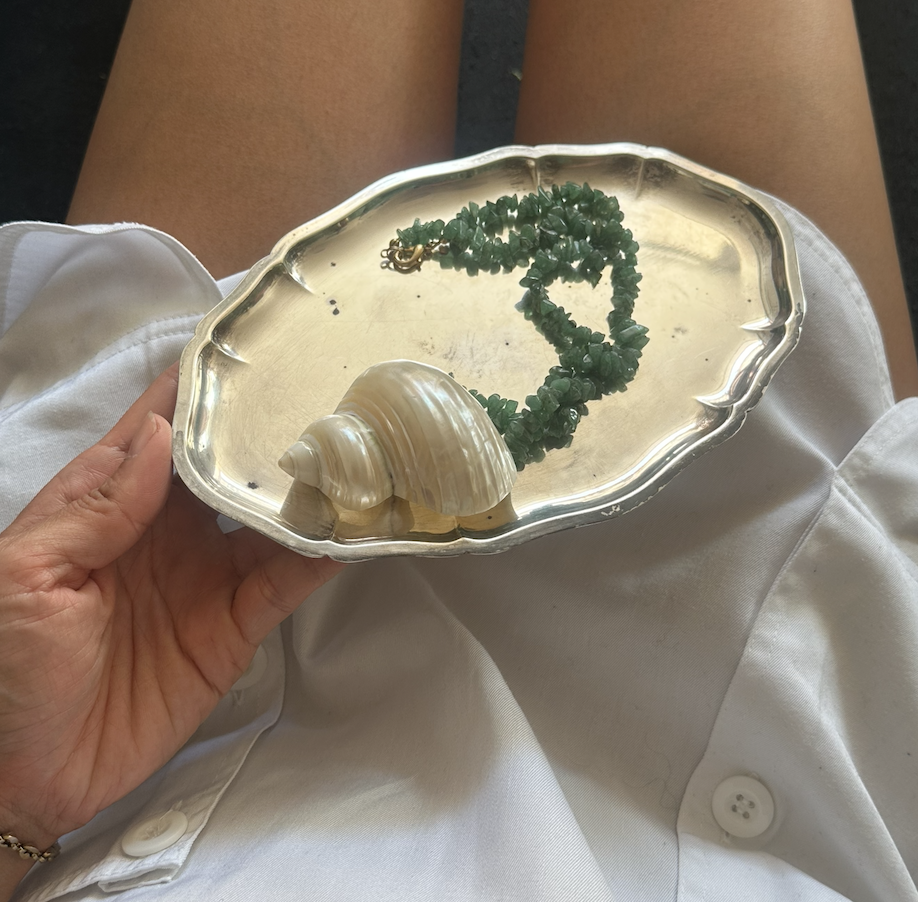 스테인리스 스틸 오벌 쉐잎 레이스 트레이 입니다. 내구성이 뛰어나고 견고하며, 세련된 디자인으로 어떤 테이블 세팅에도 잘 어울립니다. 은은한 광택과 깔끔한 마감이 특징으로 스타일리시한 아이템입니다. 고전적인 매력과 현대적인 감각이 조화를 이루어 어떤 인테리어에도 잘 어울립니다. 음식이나 음료를 나르는 본래 용도 뿐만 아니라 화장품이나 향수를 올려두어도 정리효과가 있어 보기에도 깔끔하고 아름답습니다. 세월에 흔적에 의한 생활 스크래치들이 보입니다. 이 부분이 제품의 매력을 떨어트리진 않습니다. 실용성 높은 트레이로 공간을 깔끔하고 세련되게 정리해보세요.