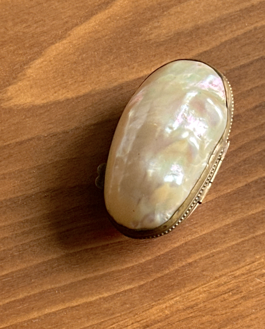1890년도에 제작된 프랑스의 빛나는 자개로 제작된 계란 모양 주얼리 트링캣입니다. 자개 자체에 굴곡이 많아 더욱 신비롭게 빛나는걸 감상하실 수 있습니다. 트링캣은 브라스로 마무리되어 정교하게 만들어졌고 자개의 자연스러운 은은한 광택과 빛 반사가 더해져 제품을 다양하게 세워 보는 각도마다 아름다운 빛을 발합니다. 유럽에서도 앤틱 컬렉터들에게 타임레스 오브제로 오랜 사랑을 받고있는 보물같은 제품입니다. 정성스럽게 만들어진 작지만 특별한 소품으로, 시간이 지날수록 가치는 높아질 제품으로 적극 추천드립니다.