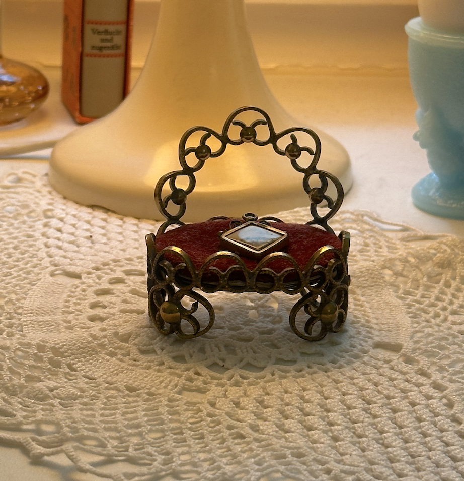 1940년도에 만들어진 고풍스러운 장식이 돋보이는 이 이탈리안 앤틱 벨벳 쇼파는 주얼리나 바늘 등을 꽂아두는 인테리어 소품입니다. 섬세한 장식 디테일은 유럽 앤틱 특유의 우아한 분위기를 간직하고 있으며, 작은 소품이지만 일상을 더욱 아름답게 만들어줄 더욱 감각적인 연출이 가능합니다.