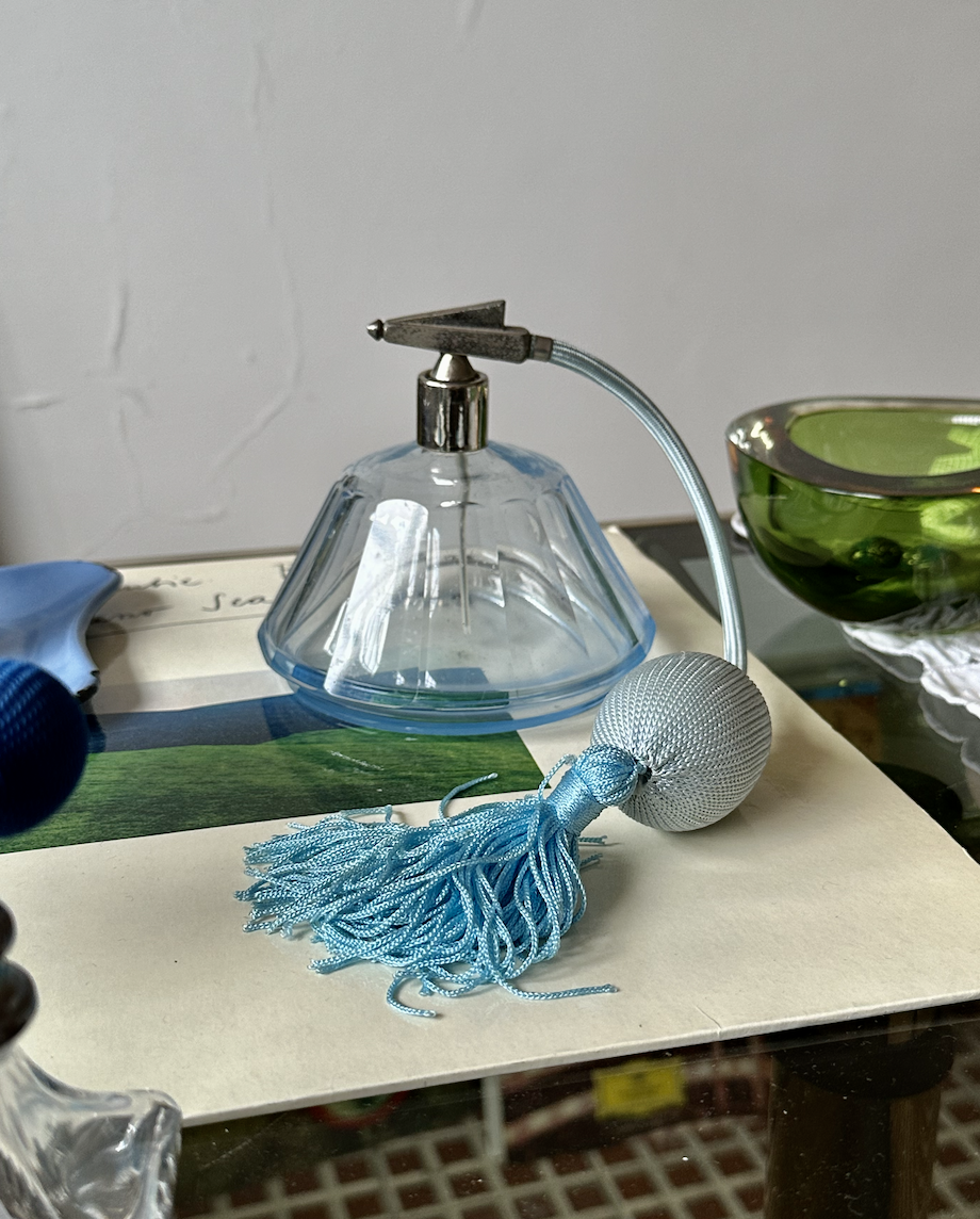 이 세련된 아르데코 향수병은 멀리서부터 알아볼 수 있을만큼 강렬한 아름다움을 가졌습니다. 아르데코 양식은 1920~1930년대에 유행했으며, 기하학적이고 세련된 디자인으로 유명합니다. 이 향수병은 아르데코의 매력을 그대로 담은, 블루 글라스의 고풍스러운 외관과 함께, 스프레이 디스펜서가 장착되어 있어 실용성과 빈티지의 로맨틱함과 아름다움을 겸비한 아이템입니다.