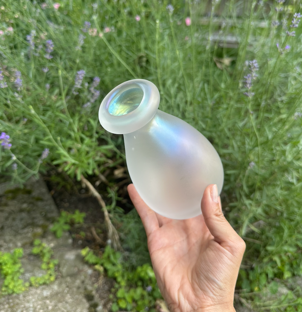 눈물방울 형태의 사랑스럽고 우아한 실루엣에 빛을 받을 때마다 영롱한 무지갯빛이 퍼지는 이리디센트 글라스 화병입니다. 체코 보헤미안 유리 예술의 대표 격인 Loetz 스타일로, 깊이 있는 색감과 텍스처, 빛의 반사감이 마치 한 점의 유리 예술품처럼 느껴집니다. 작고 묵직한 듯한 버섯을 연상시키는 부드러운 곡선은 어느 공간에 놓아도 자연스러운 포인트가 되는 오브제입니다. 빛이 없어도 자체로 무지개 빛깔로 존재감을 나타낼 아름다운 인테리어 오브제입니다.
