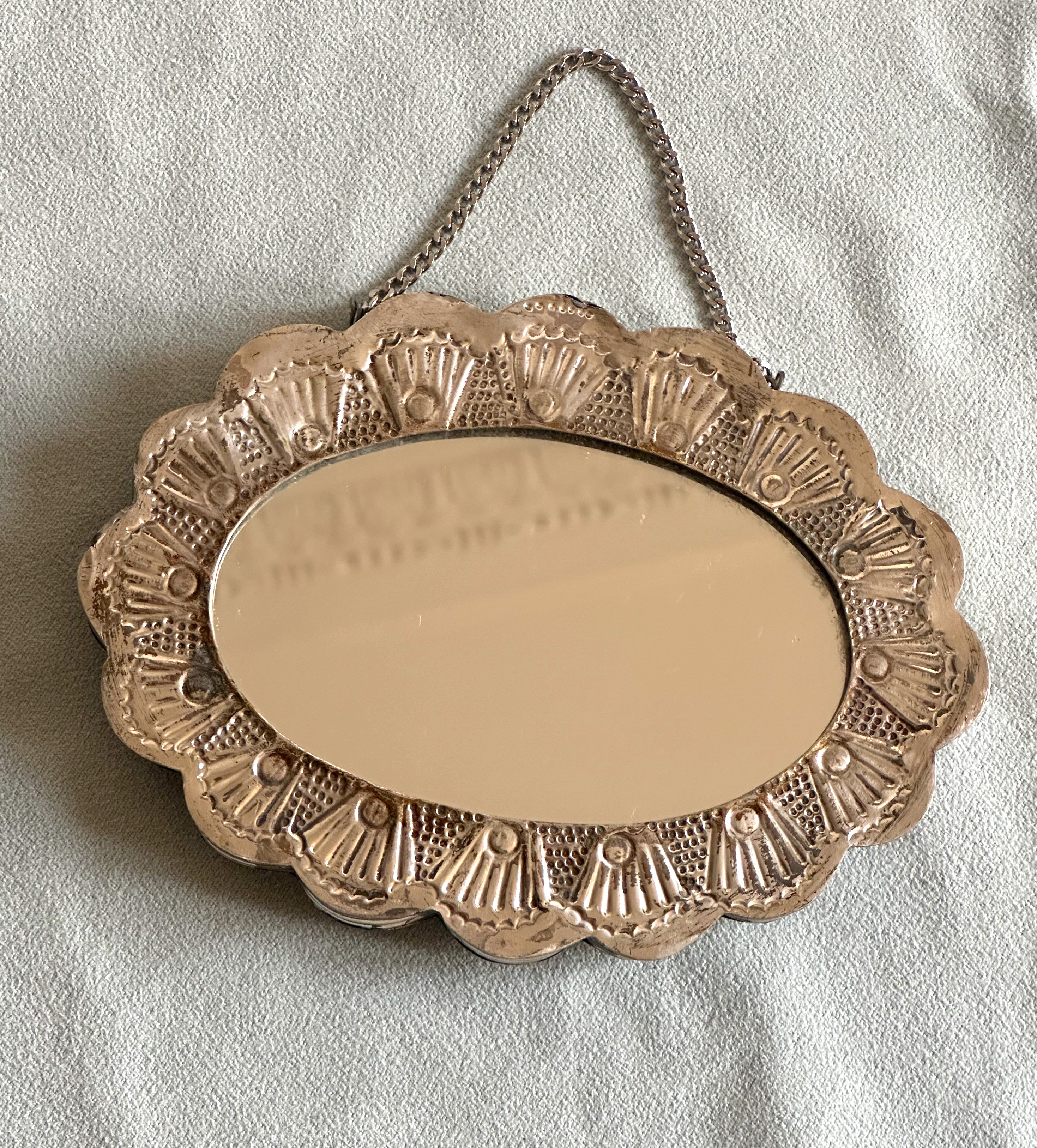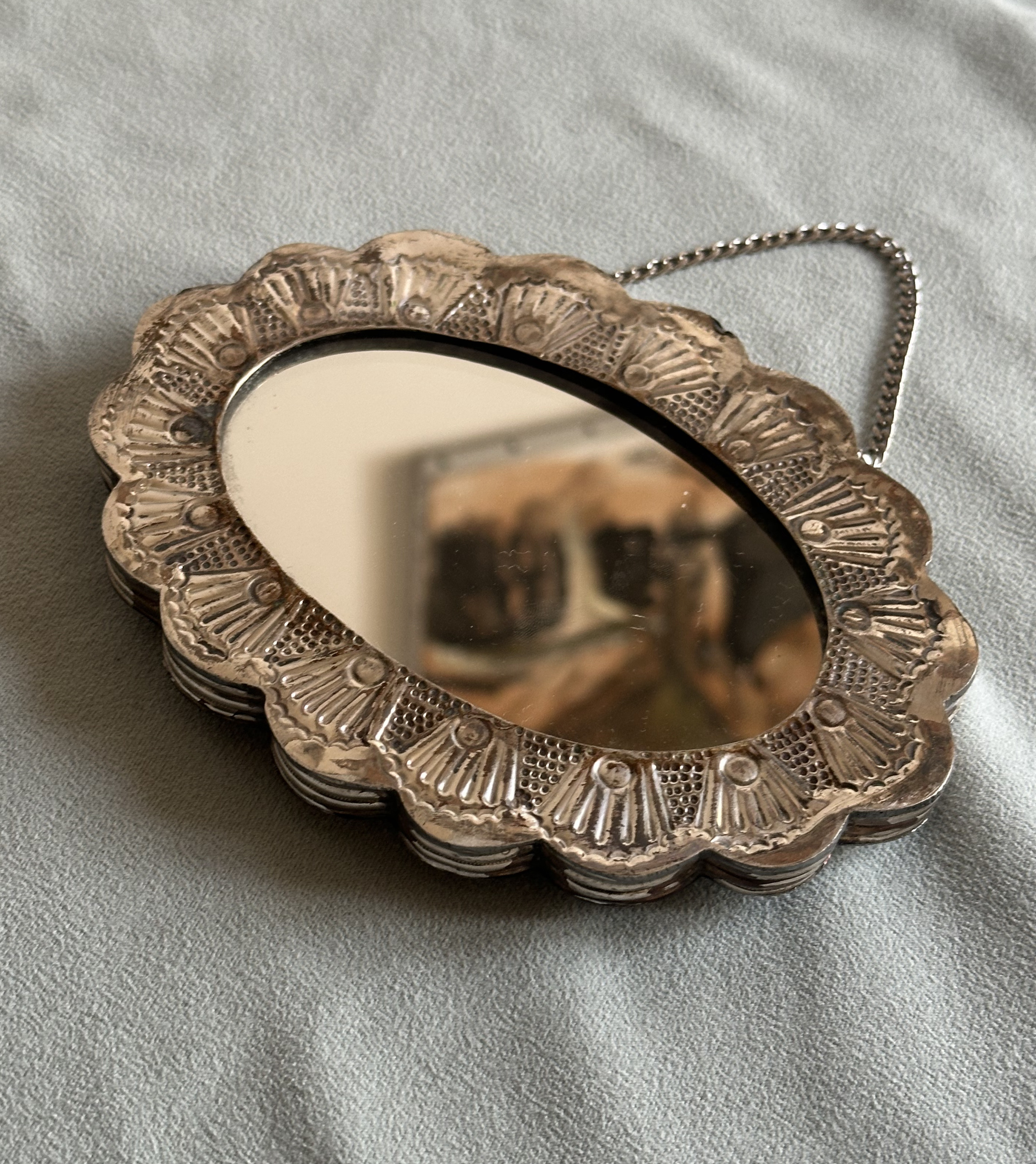 캬라멜호텔에 이미 몇번 입고가 되었는데, 그때마다 품절되던 매력적인 거울입니다. 이 거울은, 900 실버로 제작된 품격높고 클래식한 빈티지 거울로, 테두리에는 입체적인 엠보싱 장식이 더해져 품격 있는 분위기를 연출합니다. 집 안의 악한 기운을 비추어 쫓아내고, 신부에게 축복과 보호를 가져온다는 의미를 지닌 특별한 실버 아이템입니다. 단순한 장식품이 아니라 악한 기운을 물러가게 하고, 새로운 시작을 순수하게 비춘다는 상징적 의미가 있어 유럽·중동 지역에서 오래도록 사랑받아온 혼례용 오브제입니다.상단에는 체인이 연결되어 있어 벽에 걸어두기 좋으며, 뒷면에는 Kapa Silver 900 스탬프가 선명하게 찍혀 있습니다. 공간을 우아하게 밝혀주는 유럽 빈티지 거울입니다.