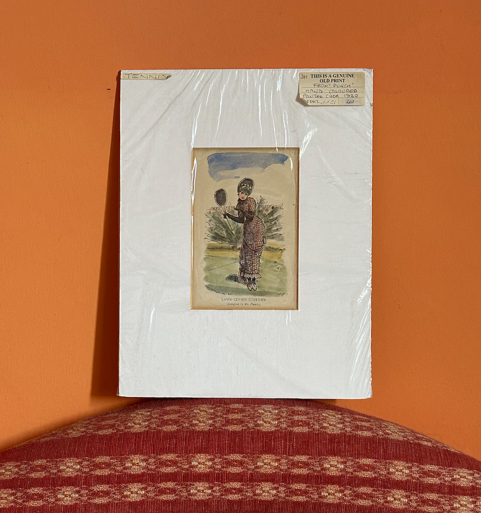 영국의 오리지널 엔틱 프린트 컬렉션입니다. 1920년도에 당시 영국 런던에서 아름다운 여성이 재치있는 모습으로 테니스복을 입고있는 핸드 컬러된 되었습니다. 오리지널 프린트는 1879년 그려진 만화로 Edward Linley Sambourne (1844 - 1910) Punch 라는 영국의 잡지를 위해 40년동안 그렸던 만화가입니다. LAWN-TENNIS COSTUME from Punch, September 13, 1879. Punch는 1840년도부터 1850년까지 역사적으로 가장 큰 영향을 주었던 잡지입니다. 프린트 뒤에 고리를 부착해 그대로 걸어둘 수 있지만, 마음에 드는 유리 액자에 넣어 보관하시면 더 고급스럽게 디스플레이 하실 수 있습니다. 세상에 하나밖에 없는 오리지널 프린트인만큼, 예술과 빈티지를 사랑하시는분에게 적극 추천해드릴 수 있는 제품입니다.