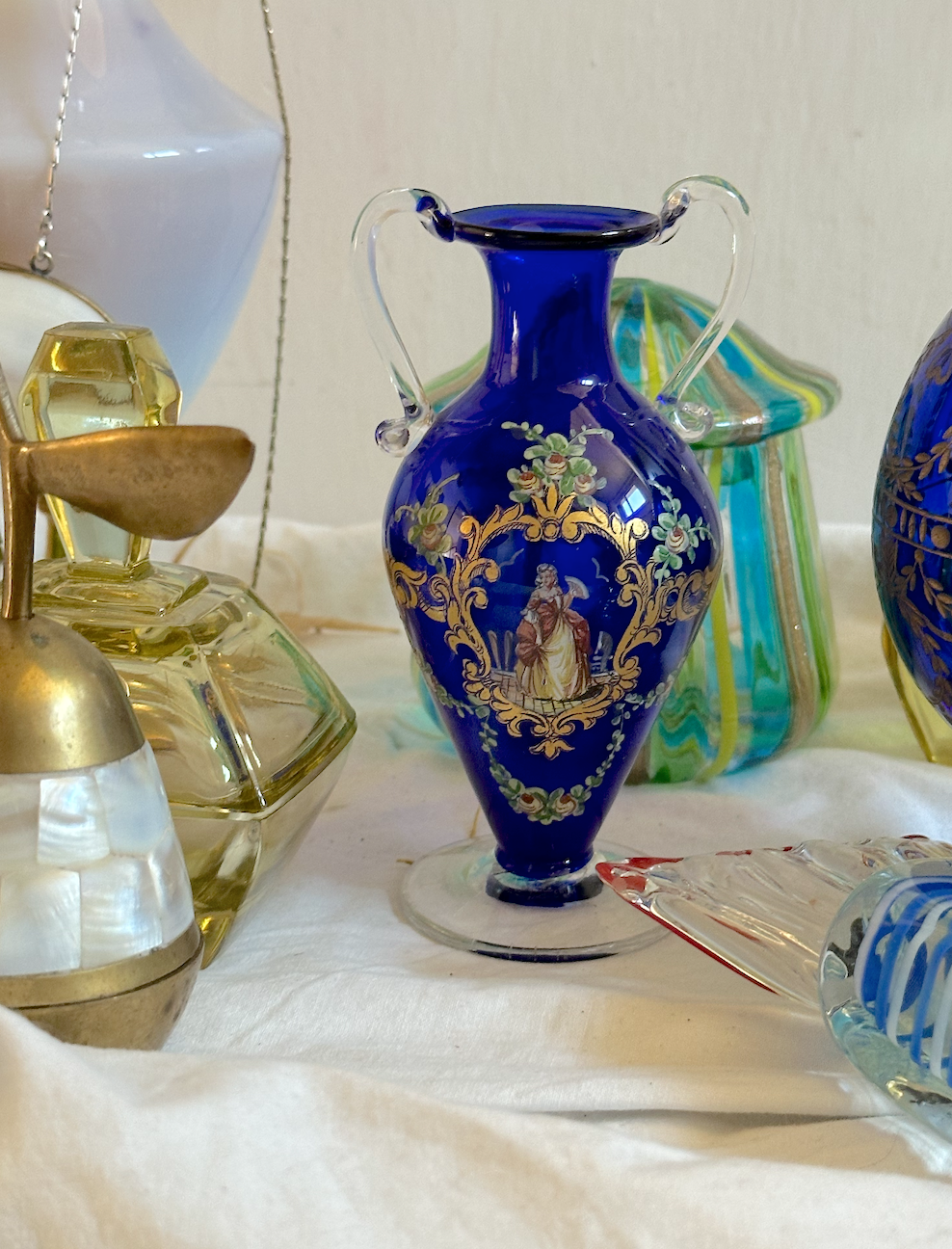 깊은 코발트 블루 색상 위에 핸드 페인팅으로 꽃무늬가 앞,뒤로 다르게 그려진, 두 개의 손잡이가 달린 앤틱한 고급 글라스 꽃병입니다. 꽃병의 양쪽에는 곡선미가 돋보이는 두 개의 손잡이가 달려 있어 실용성뿐만 아니라 장식적인 요소로도 아름다움을 더해줍니다. 손잡이의 부드러운 곡선은 전체적인 디자인에 조화롭게 어우러집니다. 수작업으로 정교하게 그려진 꽃무늬가 장식되어 있습니다. 섬세한 붓질로 그려진 꽃의 색채는 자연스러우면서도 화사한 분위기를 자아냅니다. 제품 자체에 화려한 면모가 들어나 꽃 없이도 자체적으로 아름다운 장식품으로 사용할 수 있습니다. 공간에 고급스러운 포인트를 줄 수 있는 독특한 디자인과 색감 덕분에 소장 가치가 높습니다.