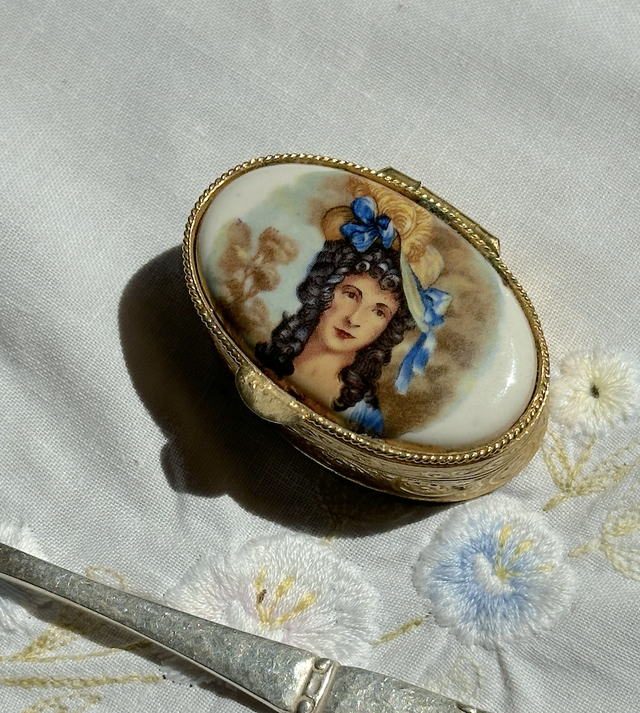 우아하고 클래식한 분위기를 담은, Lady Eleanor가 그려진 오벌형 트랜스퍼웨어 트링캣입니다. 고급 본차이나 위에 전사지 기법으로 여성 인물을 표현하고, 금빛 핸드페인팅 프레임이 정교하게 둘러싼 작품으로, 수집가들에게 특히 사랑받는 소품입니다. 여행할때 예쁘게 가지고 다닐 수 있으며 편리하지만 고급스럽고 우아한 느낌을 줍니다. 약 상자, 주얼리 상자, 또는 작은 장신구를 보관하는데 적합합니다.