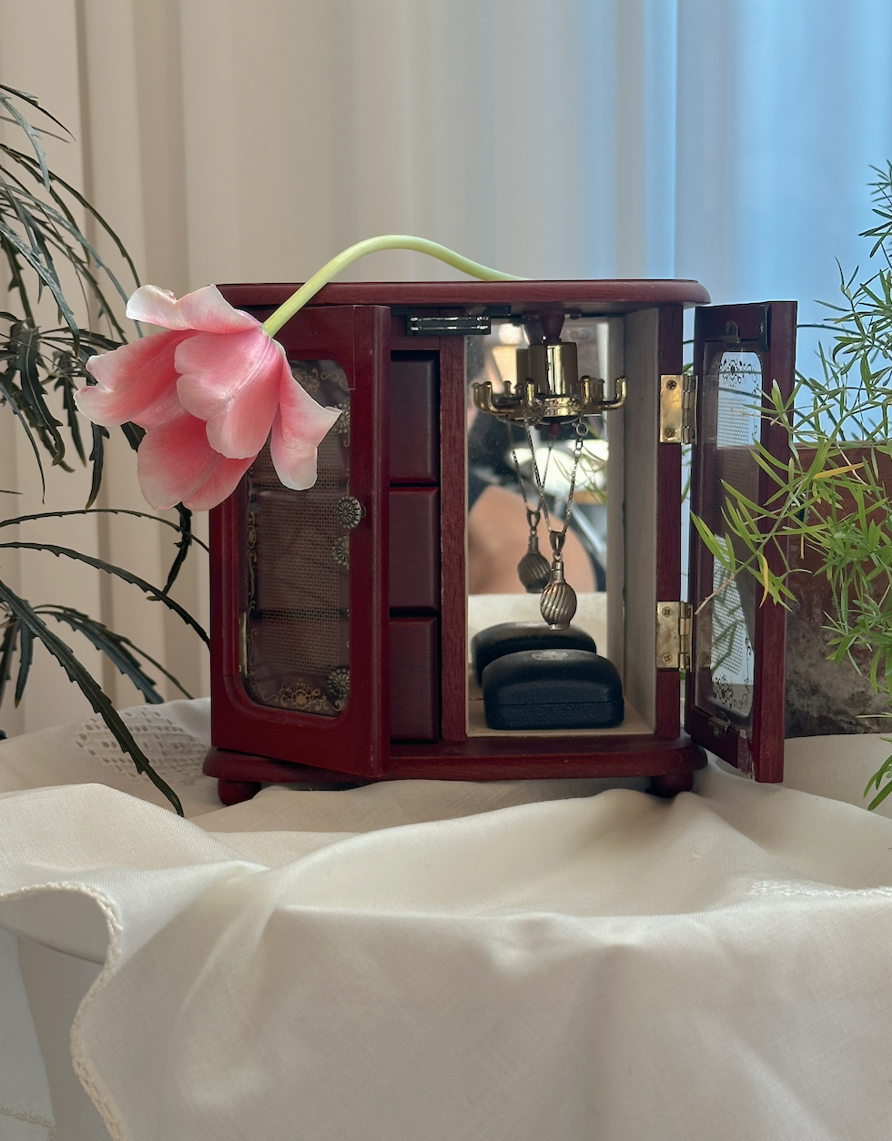 섬세한 조각과 빈티지 감성이 돋보이며, 서랍과 보관 공간이 넉넉해 반지, 목걸이, 팔찌 등 다양한 액세서리를 안전하게 보관할 수 있습니다. 서랍 내부는 벨벳으로 3칸 중 1칸은 반지보관함으로 3파트로 나뉘어져있습니다.