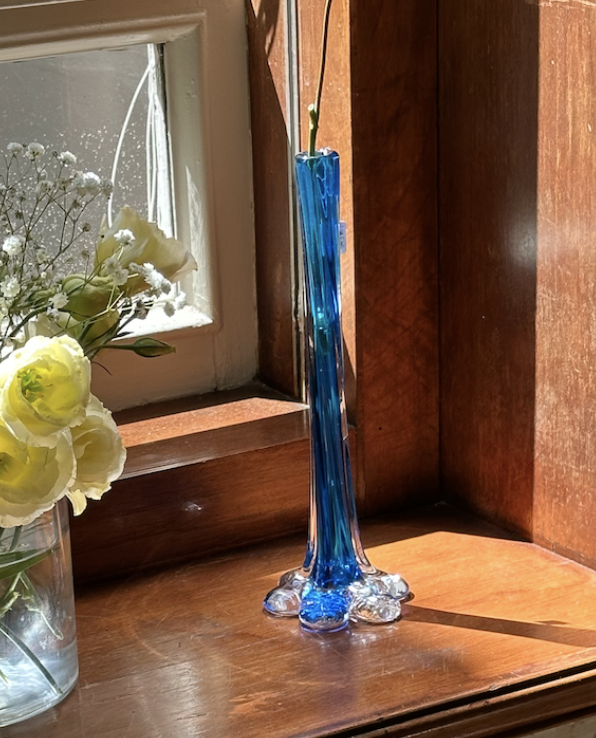 이탈리아 무라노에서 유리공예사가 직접 핸드메이드로 만든 아트글라스 화병입니다. 입으로 불어 만들고 손으로 마무리한 장인정신이 깃든 제품입니다. 쨍한 타쿠아즈 색감에 화병 바닥에 플라워쉐잎으로 마무리해 심플하지만 유니크한 분위기를 전달합니다. 모던하면서도 시크한 제품이라 포인트 인테리어 소품으로 추천드립니다. 세월의 흔적에 의한 화병 표면과 윗면에 작은 스크래치가 발견되어 가격 조정하였습니다.