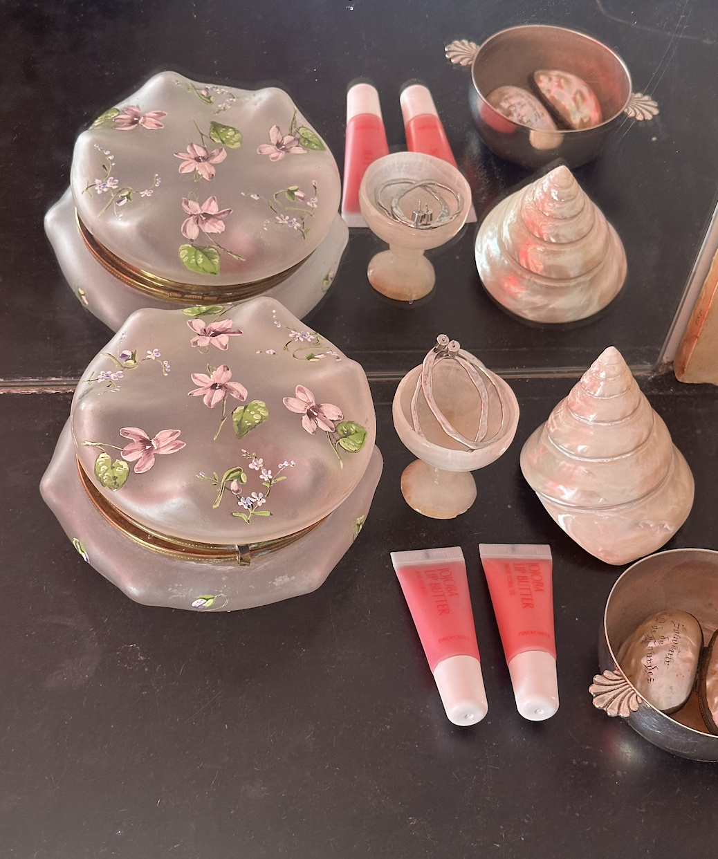 1800년대 후반, 프랑스 아르누보 시대의 거장 르그라 (Legras) 가 제작한 프로즌 몰드 글라스 봉봉니에르입니다. 표면에 새겨진 서리 낀 듯한 질감과 섬세한 핸드 페인팅 에나멜 장식이 어우러져, 단순한 보관함을 넘어 예술 작품 같은 아름다움을 자랑합니다. 당시 귀한 캔디나 귀금속, 작은 보석을 담던 용도로 제작되었으며, 오늘날에는 주얼리 박스, 트링켓 케이스, 인테리어 오브제로 활용하기 좋습니다. 145여 년의 세월을 거쳐도 변치 않는 빛과 디테일, 그리고 르그라만의 독창적인 디자인은