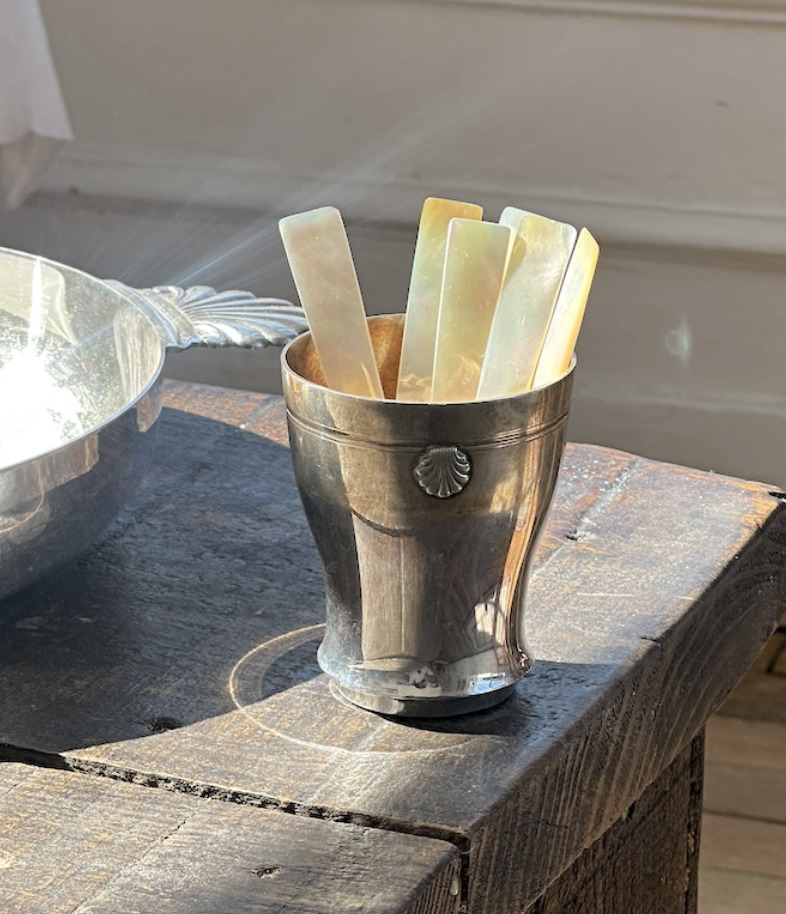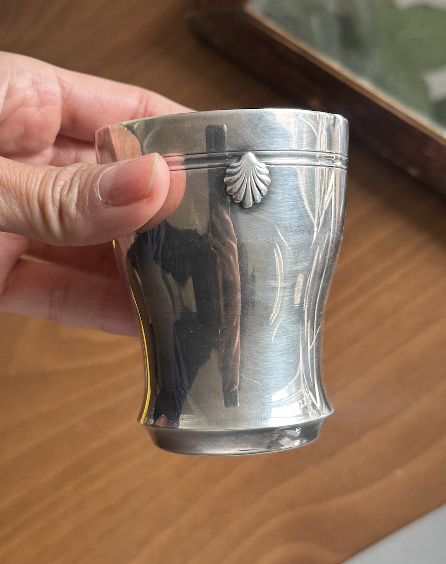 우아한 프랑스제 1960년도 실버 플레이트 쉘 모티프 컵입니다. 사진에는 시간이 남긴 생활 스크래치 자국이 있으나, 모두 관리 및 폴리싱으로 깨끗하게 지워질 수 있으며, 제품 오더가 들어오면 본래의 은빛 광택을 충분히 회복한 후에 보내드립니다. 프랑스 은도금 특유의 단정하고 클래식한 디자인으로, 테이블웨어로 사용하기에도, 화병이나 인테리어 오브제로 장식하기에도 손색없는 아이템입니다. 제품 하단에 실버 플레이트 스탬프가 보입니다.