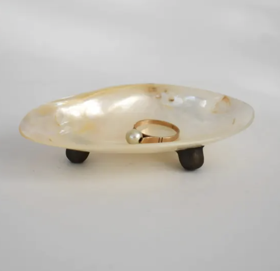 1900년도에 프랑스에서 핸드메이드로 제작된 자개 소재로 제작된 아름다운 조개 모양 트링켓 디쉬입니다. 3개의 작은 발으로 안정감을 주며, 동봉된 작은 조개 스푼과 함께 소품, 액세서리, 보석 등을 담아 장식용으로 사용하기 좋습니다. 장식용은 물론, 캐비어, 작은 잼, 소스 등 식탁 위 미니 디쉬로도 활용할 수 있는 실용적인 아이템입니다. 자개의 은은한 광택과 스캘럽 쉘 디자인이 우아하고 클래식한 느낌을 주며, 책상 위, 화장대, 혹은 선반 위 장식용으로 공간에 포인트를 더해줍니다.