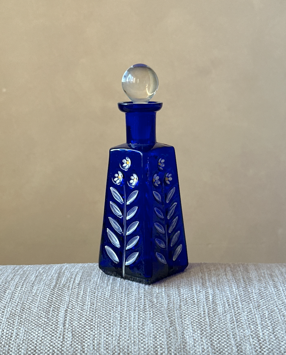 1960년도 독일에서 핸드메이드로 제작된 글라스 향수병입니다. 깊고 우아한 코발트 블루 색감에 정교하게 새겨진 핸드컷과 그 위 핸드페인트의 감성이 어우러져 빛에 따라 아름다운 반짝임을 선사합니다. 깊이가 있는 컬러에 기품 있는 디자인으로, 고급스러운 분위기를 연출합니다. 바 또는 거실 장식장에 두기만 해도 소장 가치 높은 인테리어 포인트가 되어줄 특별한 아이템입니다.
