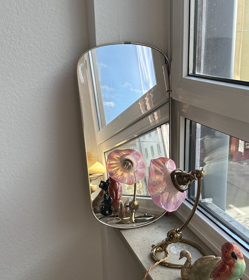 1960년대에 제작된 독일의 비대칭 실루엣의 빈티지 거울로, 유려한 곡선이 돋보이는 디자인이 공간에 세련된 미드센추리 무드를 더해줍니다. 정형화된 직사각형 형태가 아닌 자유로운 라인으로 제작되어 부드럽고 감각적인 분위기를 만들어주며, 어디에 두어도 자연스럽게 시선을 끕니다. 프레임은 따뜻한 골드 컬러로 마감되어 빛을 은은하게 반사하며 공간을 더욱 밝고 넓어 보이게 합니다. 침실, 현관, 거실, 작은 코너 공간까지 기울여 세워두기만 해도 그림 같은 연출이 가능합니다. 과하게 화려하지 않으면서도 존재감이 확실한 디자인으로,