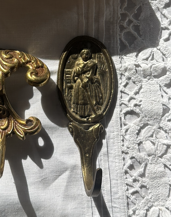 여인의 모습에 앤틱 감성이 은은하게 드러나는 빈티지 브라스 월 훅입니다. 시간이 만들어낸 따뜻한 골드빛 파티나가 정말 아름답습니다. 단순한 옷걸이가 아니라, 공간에 조용히 존재감을 더하는 장식 오브제 같은 느낌을 줍니다. 스카프, 목걸이, 키, 가벼운 가방 등을 걸기에도 좋고, 침실/현관/드레스룸 어디에나 자연스럽게 어울립니다. 작고 섬세한 디테일 하나로, 공간이 훨씬 더 품위 있고 감성적인 분위기로 바뀌는 아이템으로 실용성과 오브제 감성, 두 가지를 모두 찾는 분께 적극 추천드립니다.